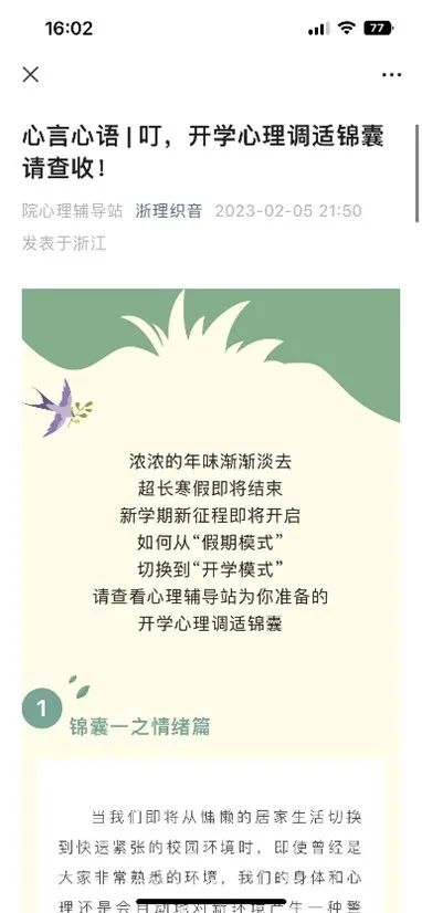 聚焦一节“心理温暖课”。为了帮助同学们更好地应对可能会面临的诸多压力和烦恼,增强同学们的心理调适能力,以更好的状态迎接下一阶段的挑战,学院于开学前期通过网络平台推送心理调节系列推文,点对点开展情况调研,掌握第一手“生情信息”。近日,在组织学生收看学校举办的“心理赋能,健心行动”活动基础上,深入开展“讨论—建言—观察”活动,辅导员、班主任和心理委员主动下沉班级、贴近同学,了解大家内心所需,有针对性形成相关工作事项,切实推动返校教育解生忧的实际成效。
