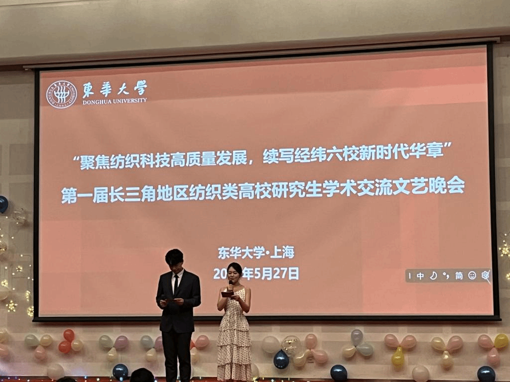 一流学科展示厅,感受东华大学的深厚底蕴与纺织的新时代新发展。下午,六所院校的师生分别在图文信息中心第三会议室和第四会议室进行学术交流活动。来自六校的24名学生代表分别展示“纺织新材料”和“纺织新技术”成果,我校黄程玲和陈亮2位同学分别就自己的研究现状为大家做了精心的汇报。傍晚,“锦绣年华·织圆行方”研究生文化交流文艺晚会在东华大学图文信息中心举办,此次晚会由6个学院的研究生带来,分为破冰、暖融、沸腾三个环节,节目形式多样,街舞、歌曲演唱、魔术以及相声,为大家带来了一场视听盛宴,也增强了文化交流。