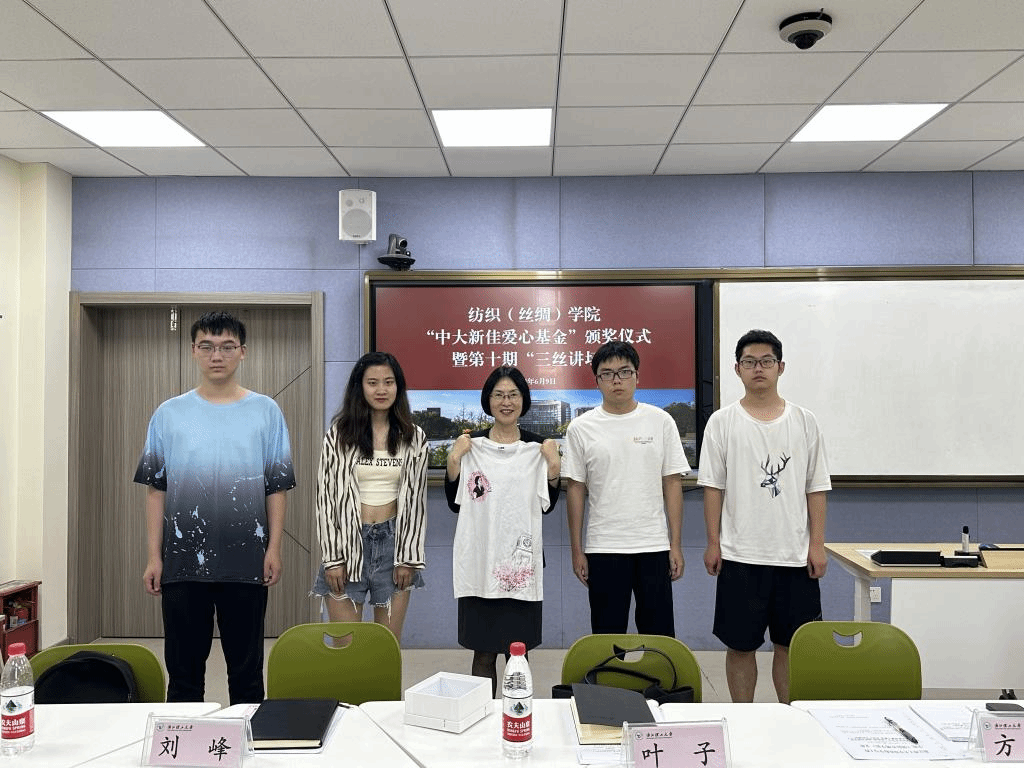 活动最后,获奖学生代表向叶子赠送了精心准备的纪念品——DIY T恤衫,图案由学生自行设计绘制而成,每位受助同学都在背面郑重签名,以表达对叶子校友、中大新佳的由衷感谢。