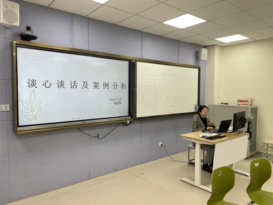 2022级本科生辅导员袁紫琳分享了关于“思想教育、寝室矛盾、心理健康”方面的三个典型案例,并与现场老师进行互动,共同探讨谈心谈话的思维与实操。