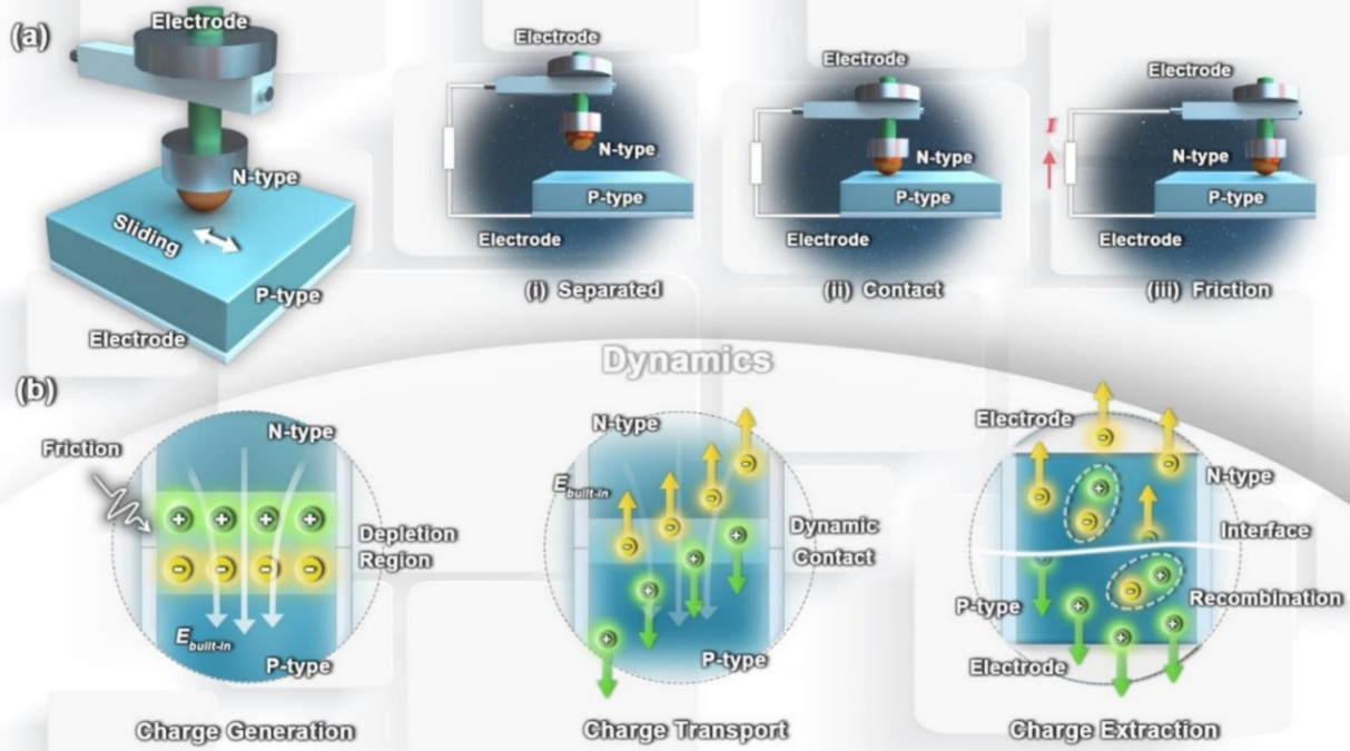 基于半导体材料的新型能量收集技术是被认为是缓解能源短缺问题的有效解决方案。其中,摩擦伏特纳米发电机(TVNG)作为一种耦合了半导体物理效应和接触起电现象的新技术,因其直接输出直流电、低阻抗和结构设计简单等独特优势而备受关注,在智能可穿戴、自供电传感及物联网系统等前沿应用领域潜力巨大。然而,TVNG仍在功率转换效率和电压输出方面存在局限,其主要受电荷载流子动力学的影响(主要涉及到半导体材料中的电荷生成、传输、提取等动态过程)。因此,如何调节电荷载流子动力学,特别是实现电荷产生、传输和提取之间的动态平衡,对高性能TVNG的设计及其多元化应用至关重要。