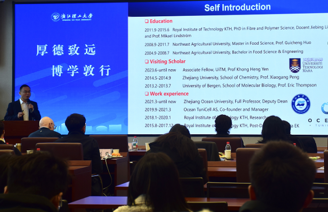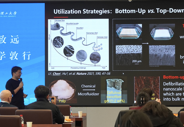 在核心的学术报告环节,来自国内外高校的7位专家学者围绕生物基纤维材料的前沿研究方向展开深入分享与探讨。其中,瑞典皇家理工学院Lars Wägberg教授和Max Hamedi教授、西湖大学王蕾教授、武汉大学陈朝吉教授、浙江海洋大学赵亚东教授、淮阴师范学院Haq Nawaz教授、中国海洋大学田维乾副教授分别就纤维素纳米纤丝/纤维基低密度材料、木材与生物高分子功能材料、细菌纳米纤维素组装为湿度响应性超强纤维、基于绿色溶剂的木质纤维生物质精炼、多用途纤维素基功能材料、木质纤维生物质重构与增值应用、纳米纤维素/MXene基强韧薄膜的自组装及离电应用等关键专题,带来了内容丰富、兼具深度与前瞻性的学术报告。报告过程中,专家们不仅展示了各自团队的最新科研成果,还针对技术瓶颈、应用前景等问题与西湖大学、浙江农林大学、浙江科技大学等高校学者展开热烈交流,为领域内技术难题的攻克和创新路径的探索提供了多元思路。