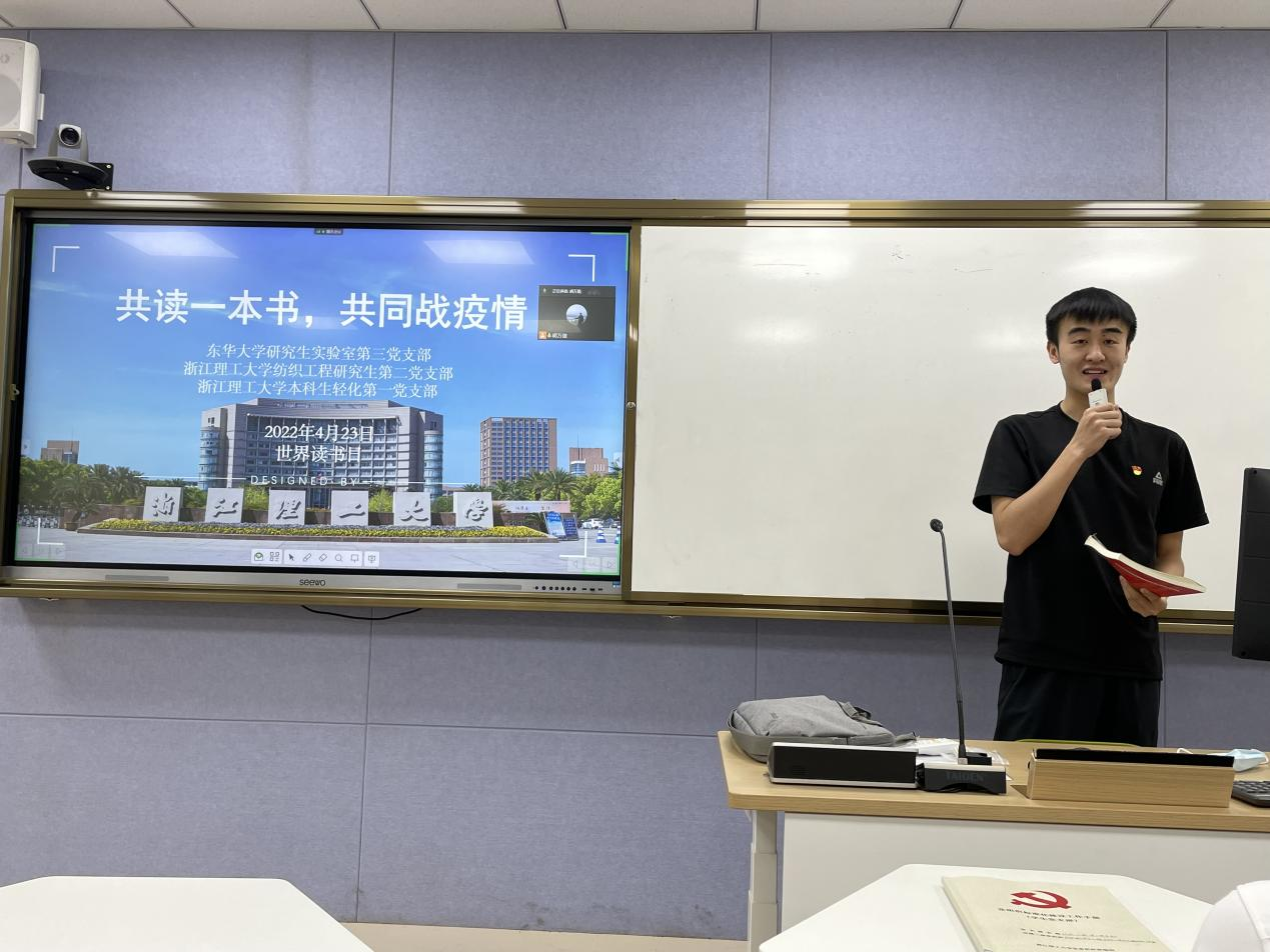 本次线上读书分享会,双方高校的支部党员围绕着习近平总书记提出的“既多读有字之书,也多读无字之书”的经典表述展开讨论,并上台进行阅读分享。本科生轻化第一党支部党员杨孝全结合自身求学经历,讲述了阅读《林海雪原》、《铁道游击队》等红色书籍对他决心发展成为一名中共党员的精神影响和力量指引。他表示阅读有字之书不仅使他努力学好科学文化知识,打下扎实的知识基础,同样也培植了自身的精神信仰根基。而东华大学化工学院实验室第三党支部党员杨厚裕表示,从本科到读研的阶段,使自己学会思考和成长的是科研创新的“无字之书”。他讲述了自己进行课题研究和实验创新的种种经历,既有在纺织相关企业的实践和实习,不断了解行业痛点并确定科研突破方向,又有通过暑期社会实践走进基层,逐步积累人生经验和社会知识。而正是这些经历使他坚定选择继续读研,将科技兴纺的梦想和党员职责使命有机结合起来。而后,不同支部的党员以线上云端交流平台为媒介,围绕着书籍类别、阅读方式、借阅场馆等多个热点话题进行探讨,彰显了蔷薇后花园