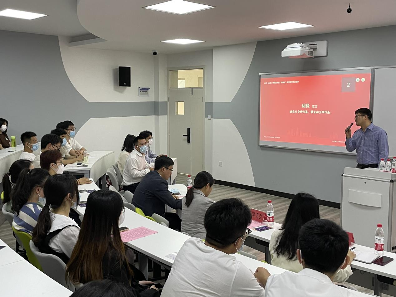 研究生导师、班主任代表胡毅在活动中发言,他结合自身担任班主任和从事科研工作的经历,鼓励大家要积极架构专业知识体系,不断增强创新突破能力,牢牢秉持“风清气正”理念,共同打造清廉且富有激情的学术文化氛围。