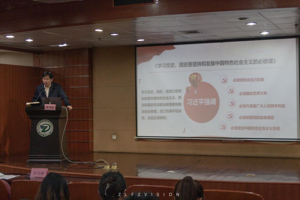 接下来,徐伟强书记围绕《论中国共产党历史》开讲本次党课。徐老师以该书的每一编为一个要点,简要地向在座同学分析了36个要点,并结合党史发展脉络为在座同学做了一个简单梳理。他结合自身开展科研工作和党史学习的实际经验和亲身体悟,向在座同学讲述了“实现中华民族伟大复兴”这个梦想对于我们的历史、现在以及未来的意义所在,他融会贯通地将改革开放前后两个历史时期的本质和当前开展党史学习教育的重要性结合起来,深刻阐释革命圣地西柏坡的意义,引导同学们进一步认识到革命精神与革命老区的重要性,要不断地汲取延安精神的力量,从中国革命历史这一最好的营养剂中不断提升自身的理想信念。他用生动的语言、严谨的思维、形象的例子将百年党史的一幕幕以及习近平总书记重要论述活灵活现地展现在同学面前,他教导在座学生要在大学打下坚实的基础,养成勤奋、诚信、坚强、积极向上、守规矩的良好习惯,在学悟党史、实际践行中增强自己的使命感,为自身、学校甚至国家而努力奋斗。在座学生纷纷表示深有启发。